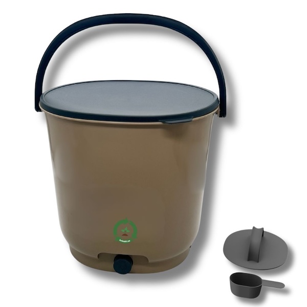 Hinkarna är tillverkade i EU av återvunnen plast och har handtag, tätslutande lock, perforerad inre bottenplatta samt kran för avtappning av bokashivätska.
