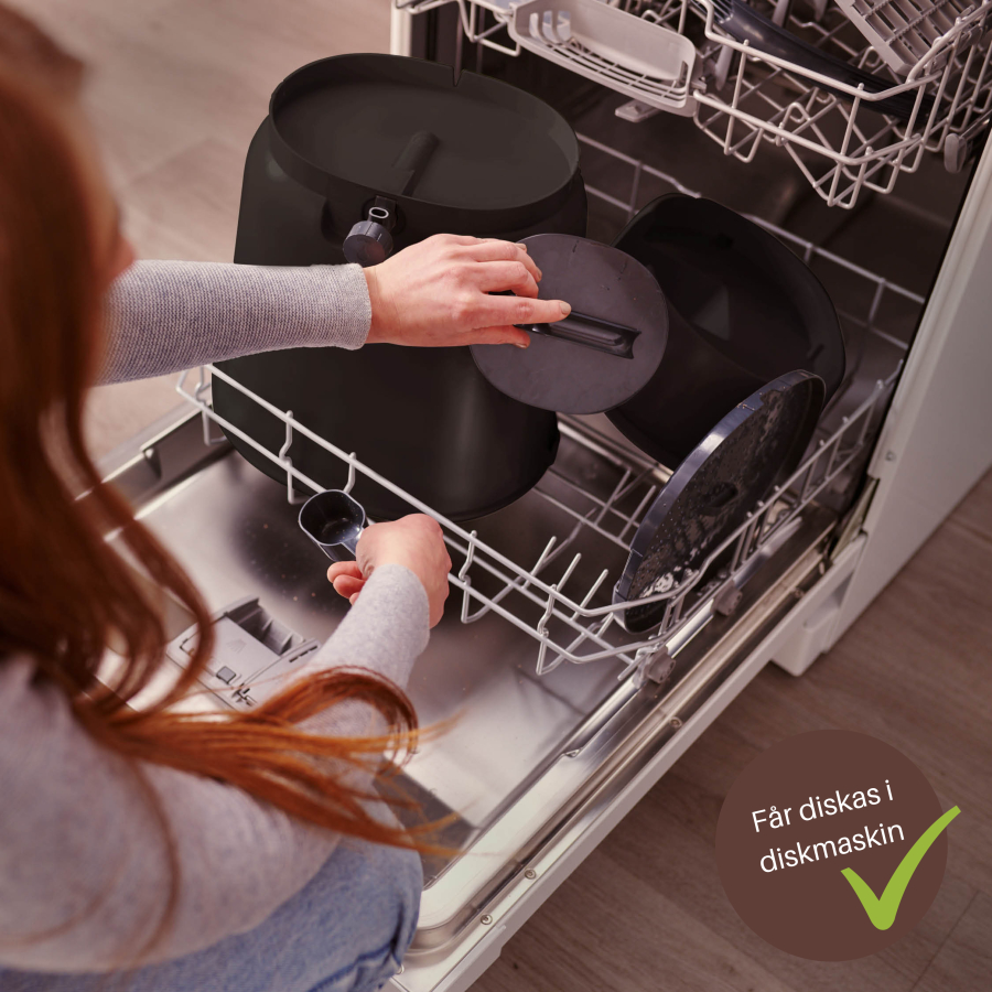 Hinken är anpassad för placering i diskbänksskåp. Den är lätt att hantera och bära, görs enkelt ren med vatten. Hinken får även diskas i diskmaskin (högst 55 grader). (Locket ska ej diskas i diskmaskin.)