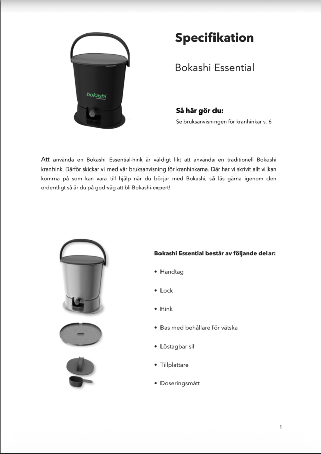 Hinkarna är tillverkade i EU av återvunnen plast och har handtag, tätslutande lock, perforerad inre bottenplatta samt kran för avtappning av bokashivätska.