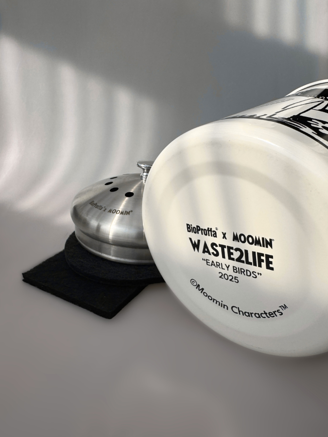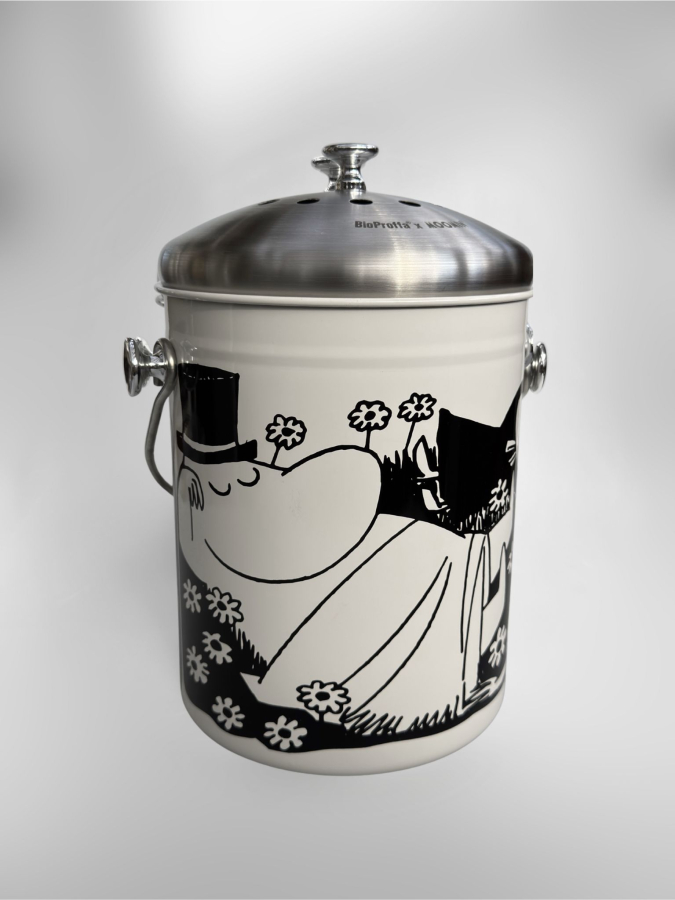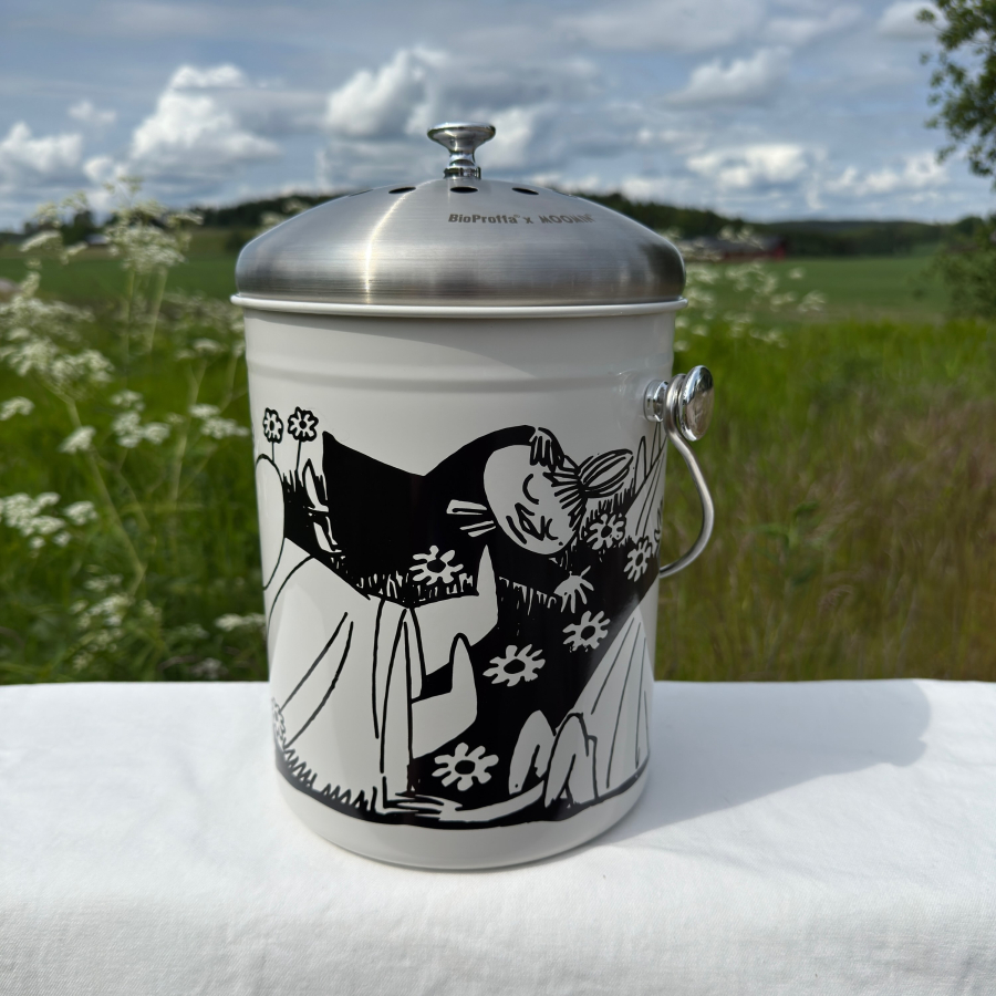 Mumins hink för matuppsamling blir en otroligt vacker inredningsdetalj i ditt kök. Det är tillverkad av rostfritt stål, har en innerhink med praktiskt handtag som går bra att diska i maskin. Locket är tätt mot fruktfrugor och har två kolfilter som förhindrar dålig lukt.