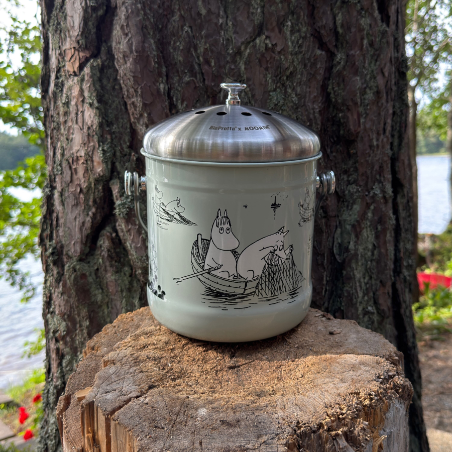 Mumins hink för matuppsamling blir en otroligt vacker inredningsdetalj i ditt kök. Det är tillverkad av rostfritt stål, har en innerhink med praktiskt handtag som går bra att diska i maskin. Locket är tätt mot fruktfrugor och har två kolfilter som förhindrar dålig lukt.