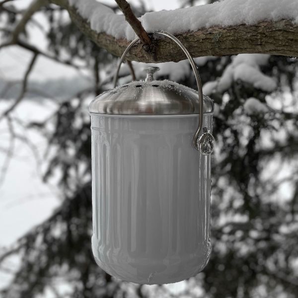 Skonsam rengöring: För att bevara hinkens fina finish och emaljens kvalitet bör hink, lock och filter handdiskas med ett milt diskmedel. Undvik vassa borstar eller slipande stålull som kan skada ytan.